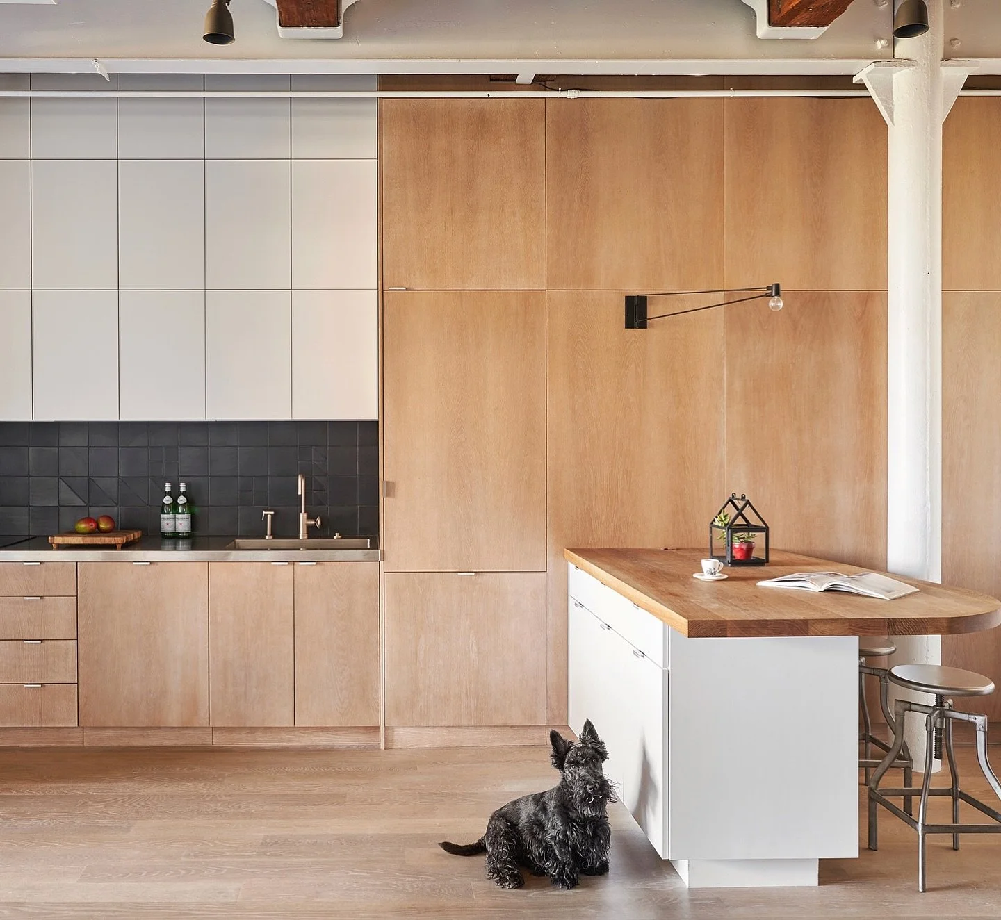 Modern kitchen with white cabinetry, marble backsplash, large window with blinds, potted plant, pitcher, dishes, and bar stools.