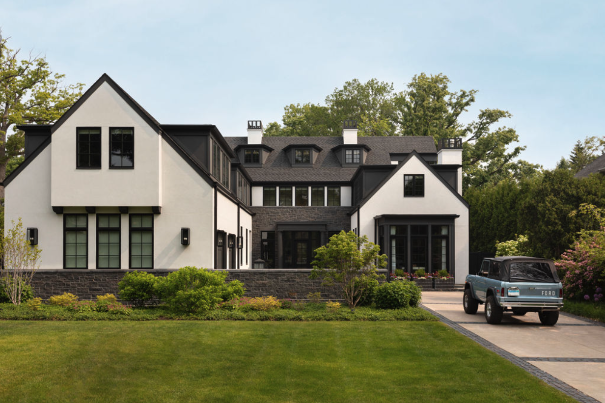 Large white house with multiple chimneys and dormer windows, surrounded by a well-maintained garden and trees, with a curved paved driveway in front.