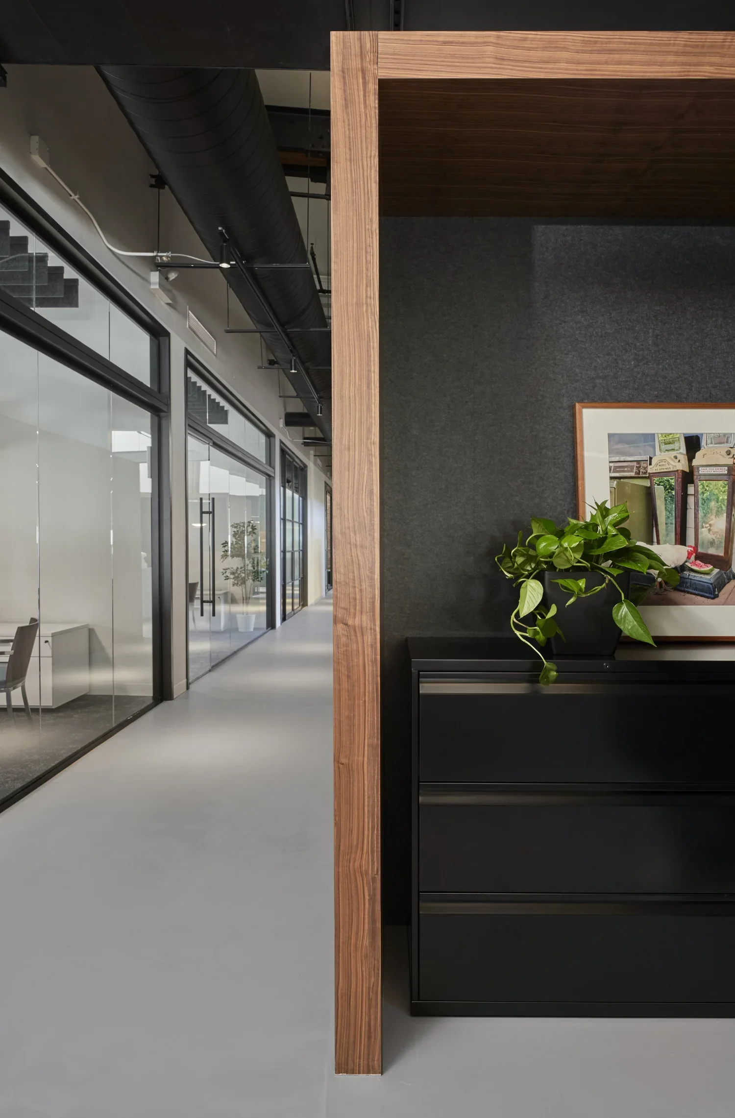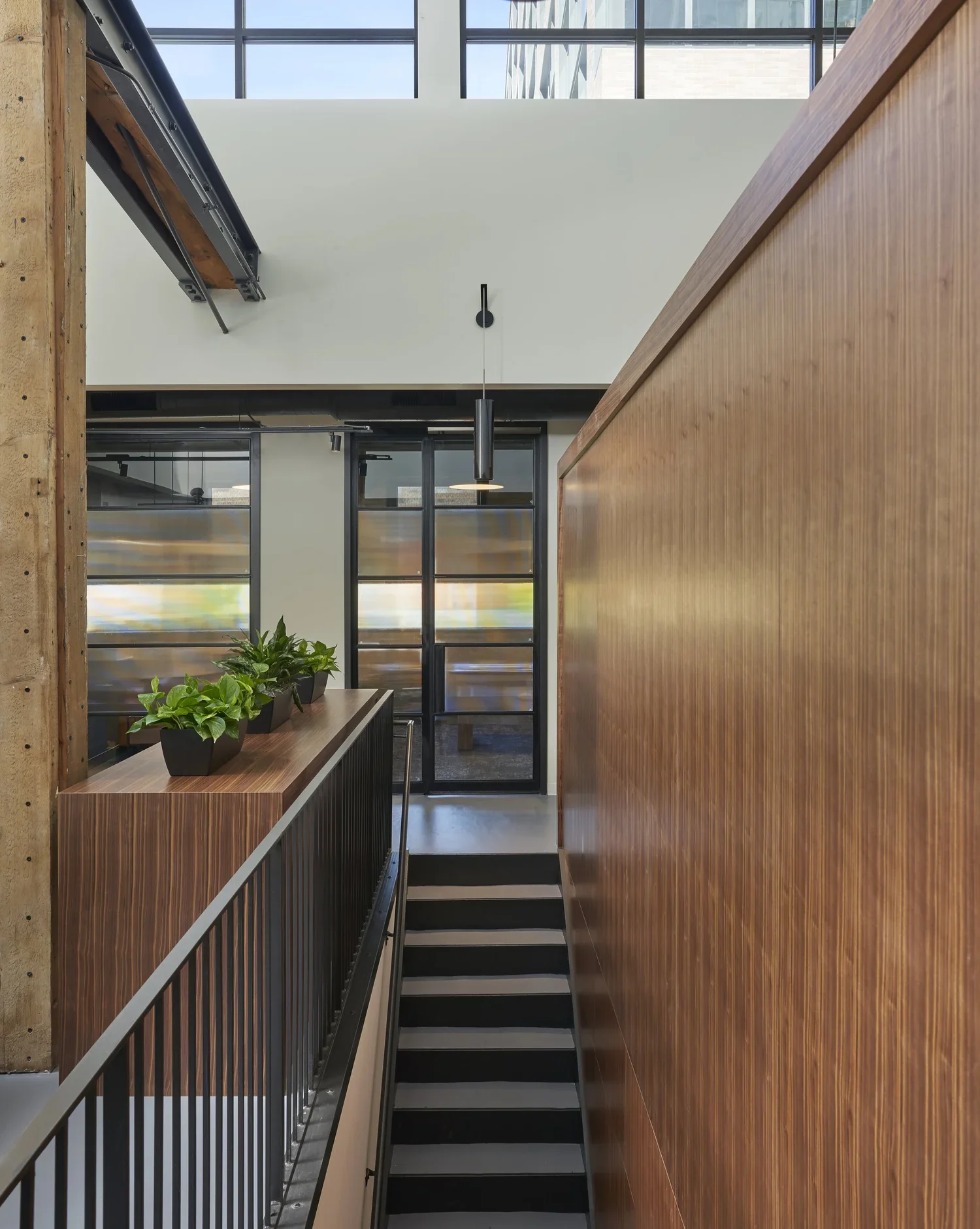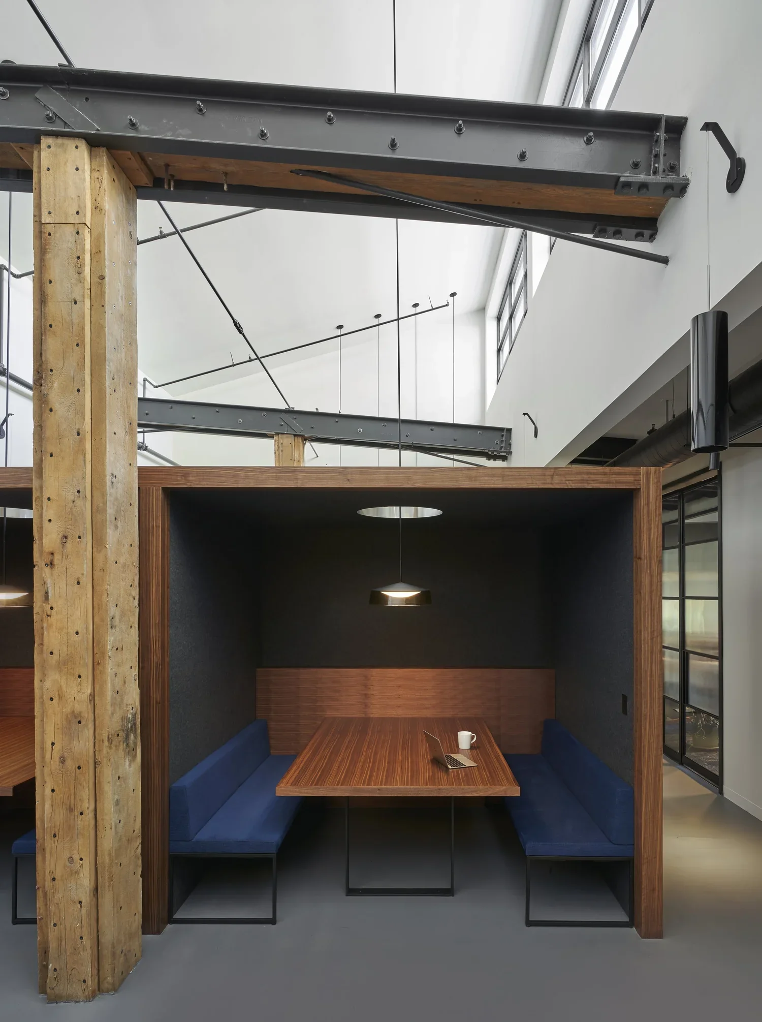 Custom walnut cabinetry and panels shape the public and private spaces, while plush seating, tailored huddle booths, and curated textiles lend a quiet sense of luxury throughout. Moments like the cut-through lighting in the walnut booths, the wrapped stairwell with custom steel panels, and exposed structural elements reflect a commitment to both design clarity and permanence—not often found in corporate interiors.