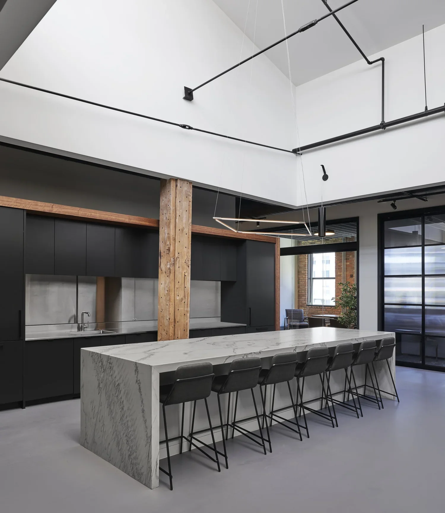 Set within a three-story West Loop loft, the buildout balances the grit of exposed timber and brick with custom millwork, layered lighting, and a deliberately refined material palette. Working within the shell provided, En Masse tightened the visual language of the space—using warm woods, steel, and muted tones to bring coherence and contrast to the building’s raw structure.