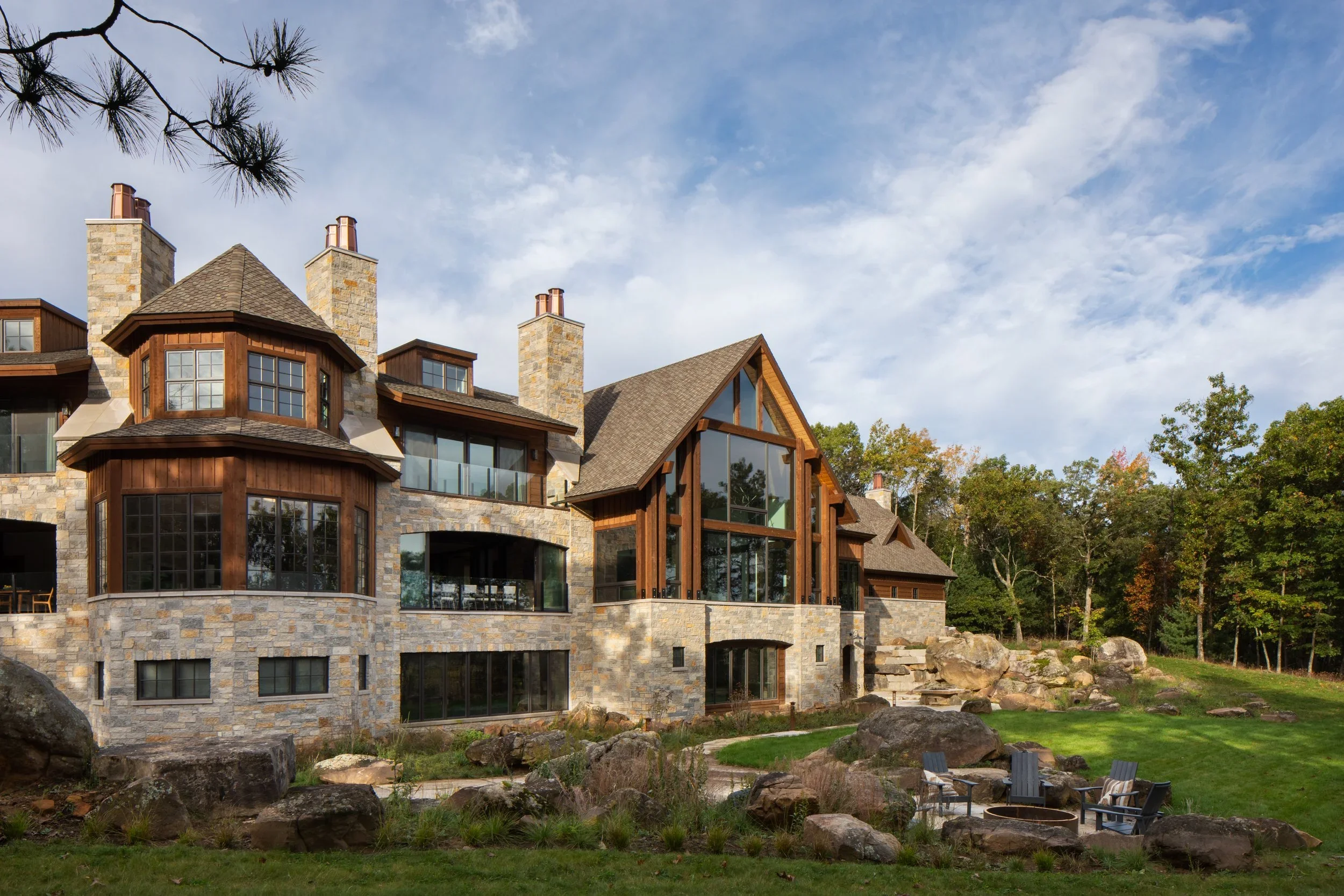 The structure is bold: exposed timber, full-height stone, and dramatic pitched ceilings. But these elements are softened by natural light, layered textures, and moments of play. A wall of sliding glass doors surrounds the great room, transforming it into a modern porch when opened to the outdoors. A generous kitchen, vaulted bedrooms, and a sculptural stair anchor the main spaces, while custom details—like a bunkroom built into the dormers—carry warmth and personality throughout.