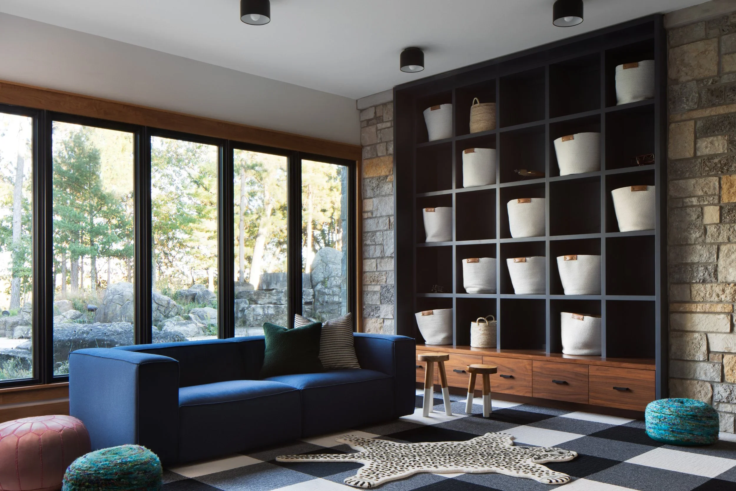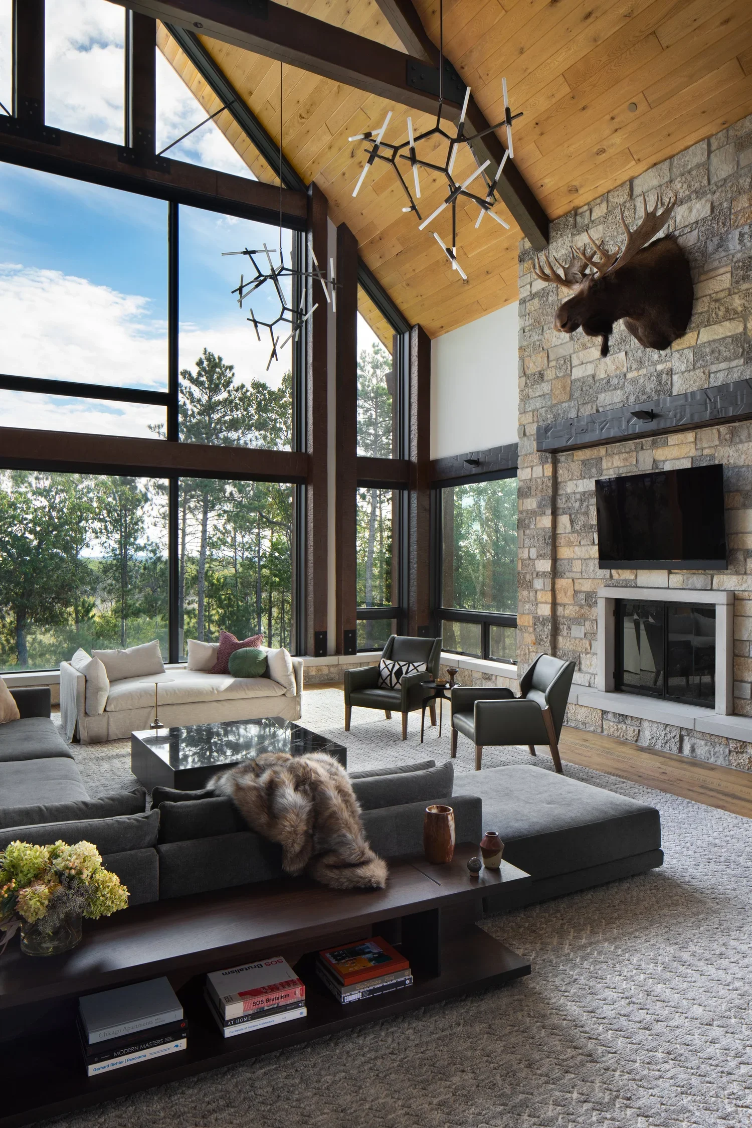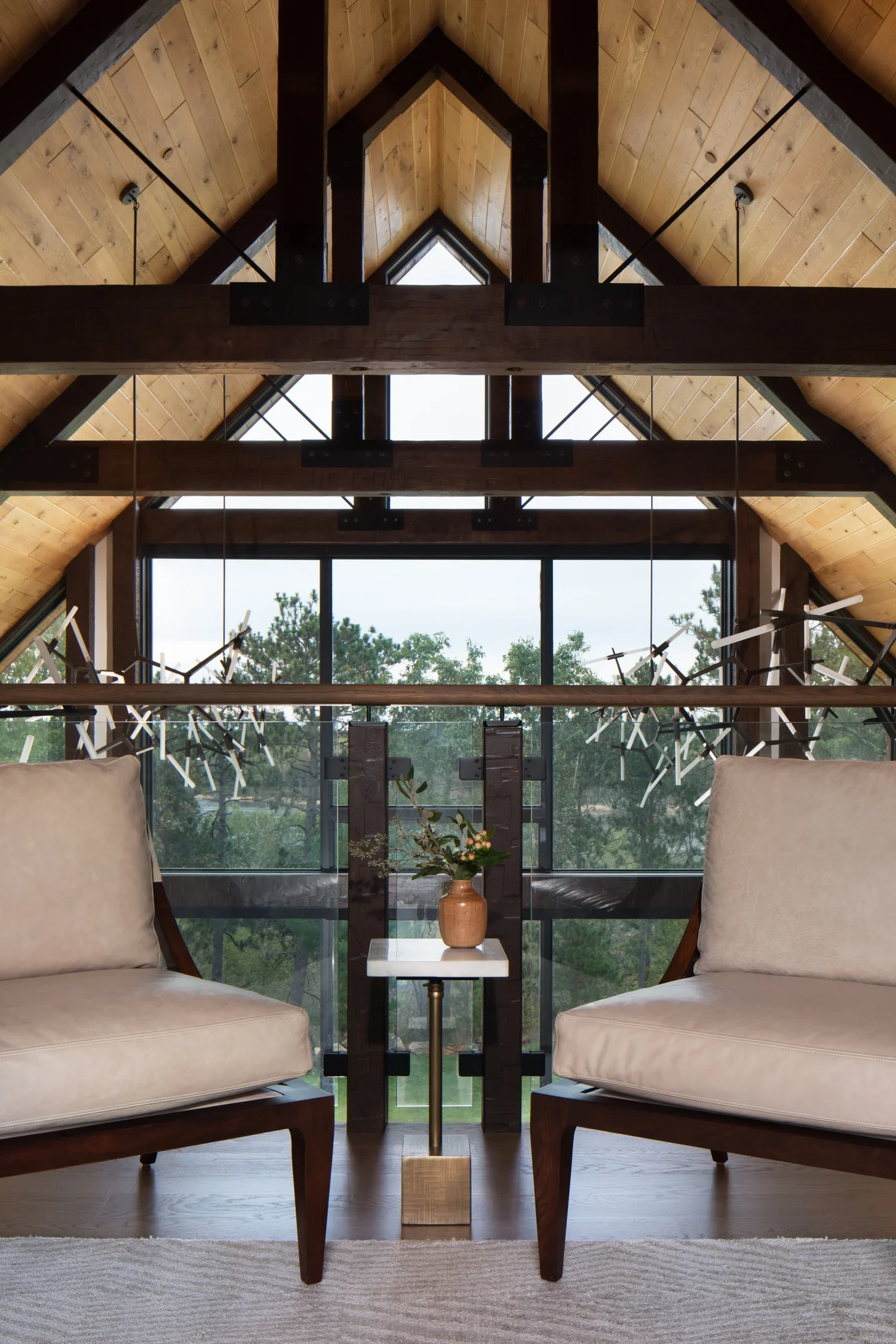 Interior finishes nod to the surrounding landscape with tones of cream, green, and wood. Touches of blackened metal and clean-lined fixtures contrast the rustic envelope, balancing weight with refinement. Designed for all seasons, the home transitions effortlessly from summer weekends on the lake to winter evenings by the fire—always making space for connection.