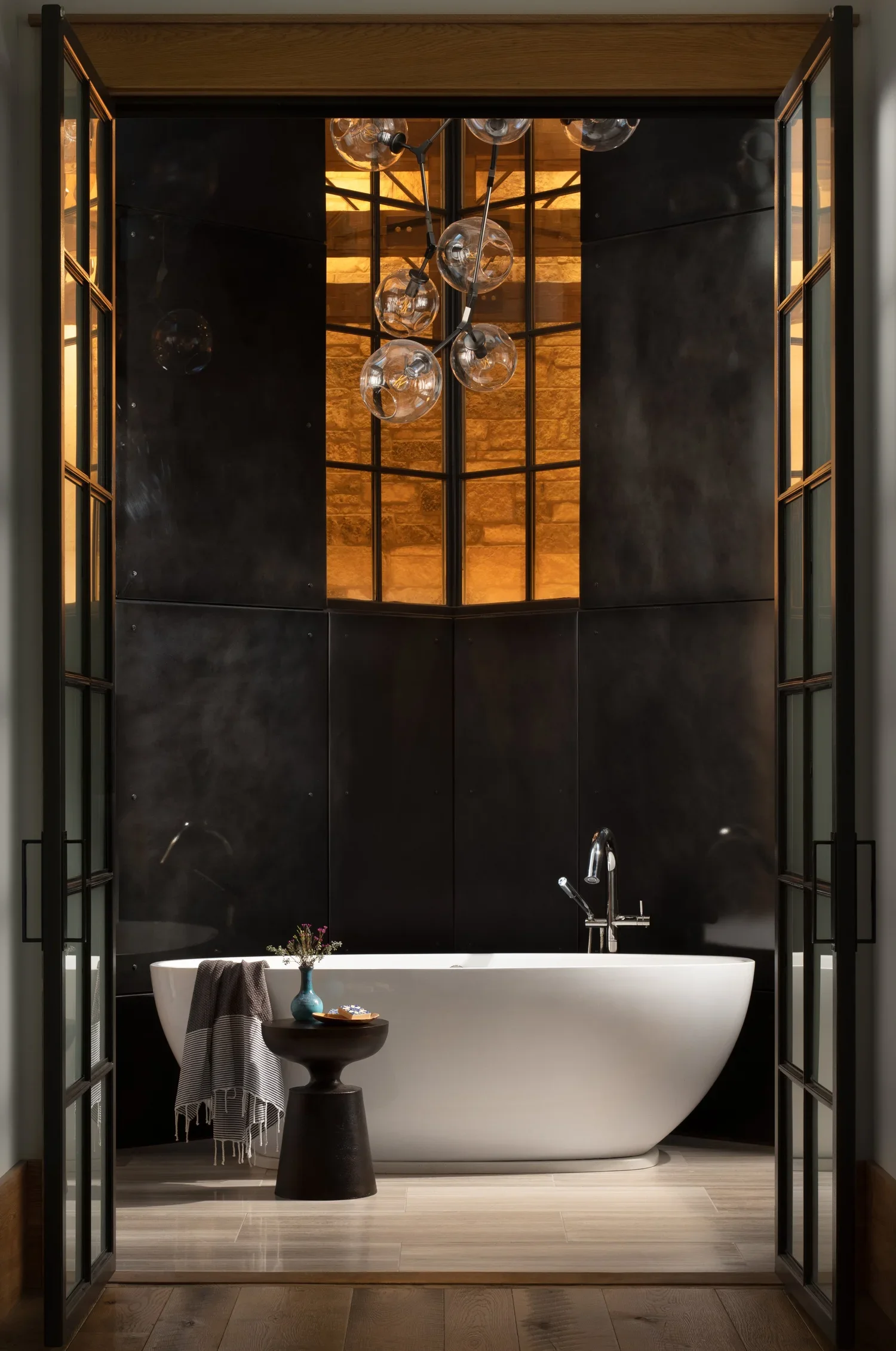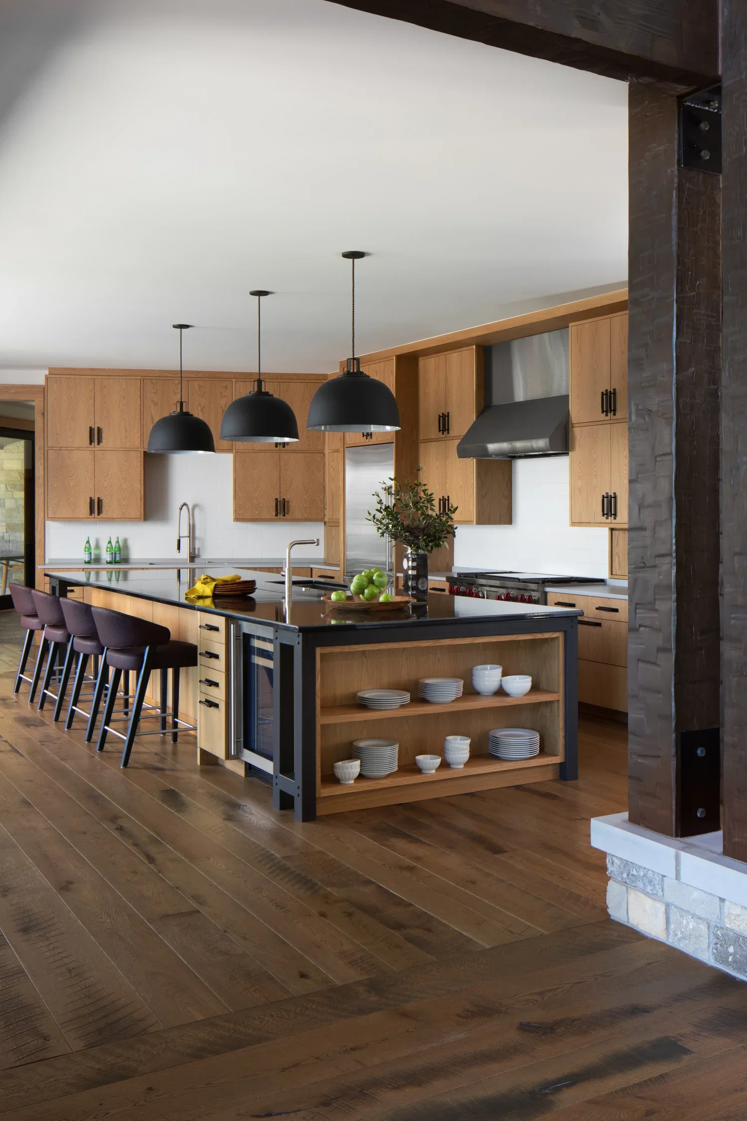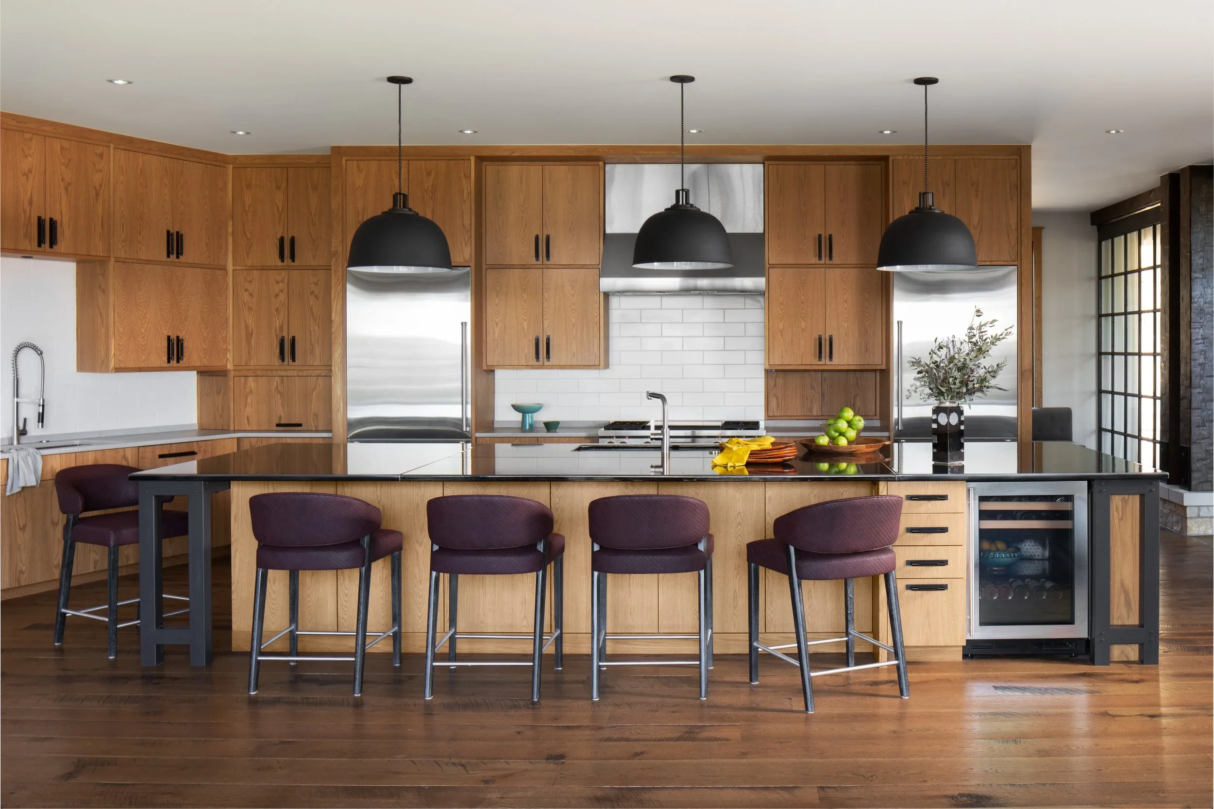 Interior finishes nod to the surrounding landscape with tones of cream, green, and wood. Touches of blackened metal and clean-lined fixtures contrast the rustic envelope, balancing weight with refinement. Designed for all seasons, the home transitions effortlessly from summer weekends on the lake to winter evenings by the fire—always making space for connection.