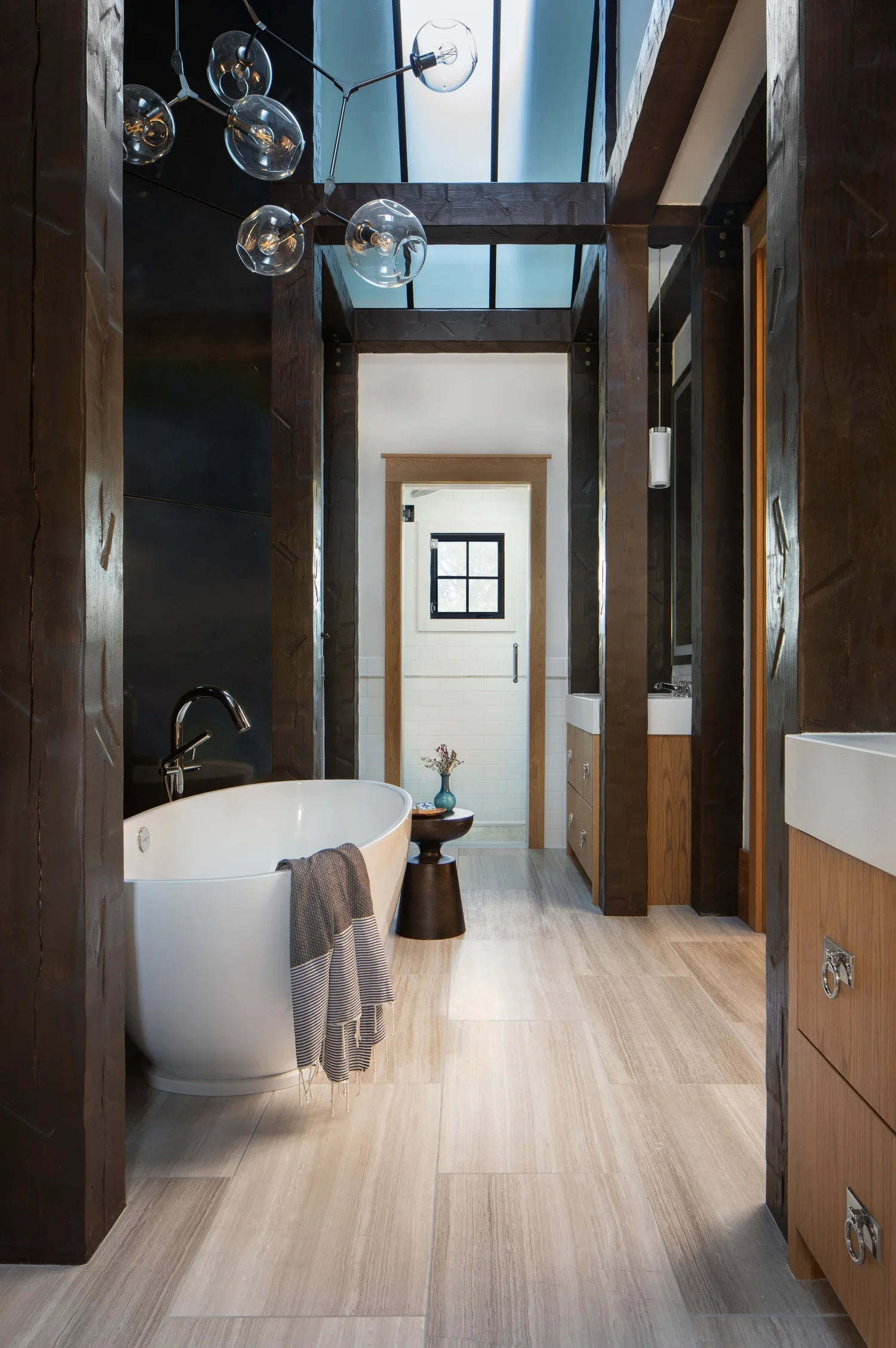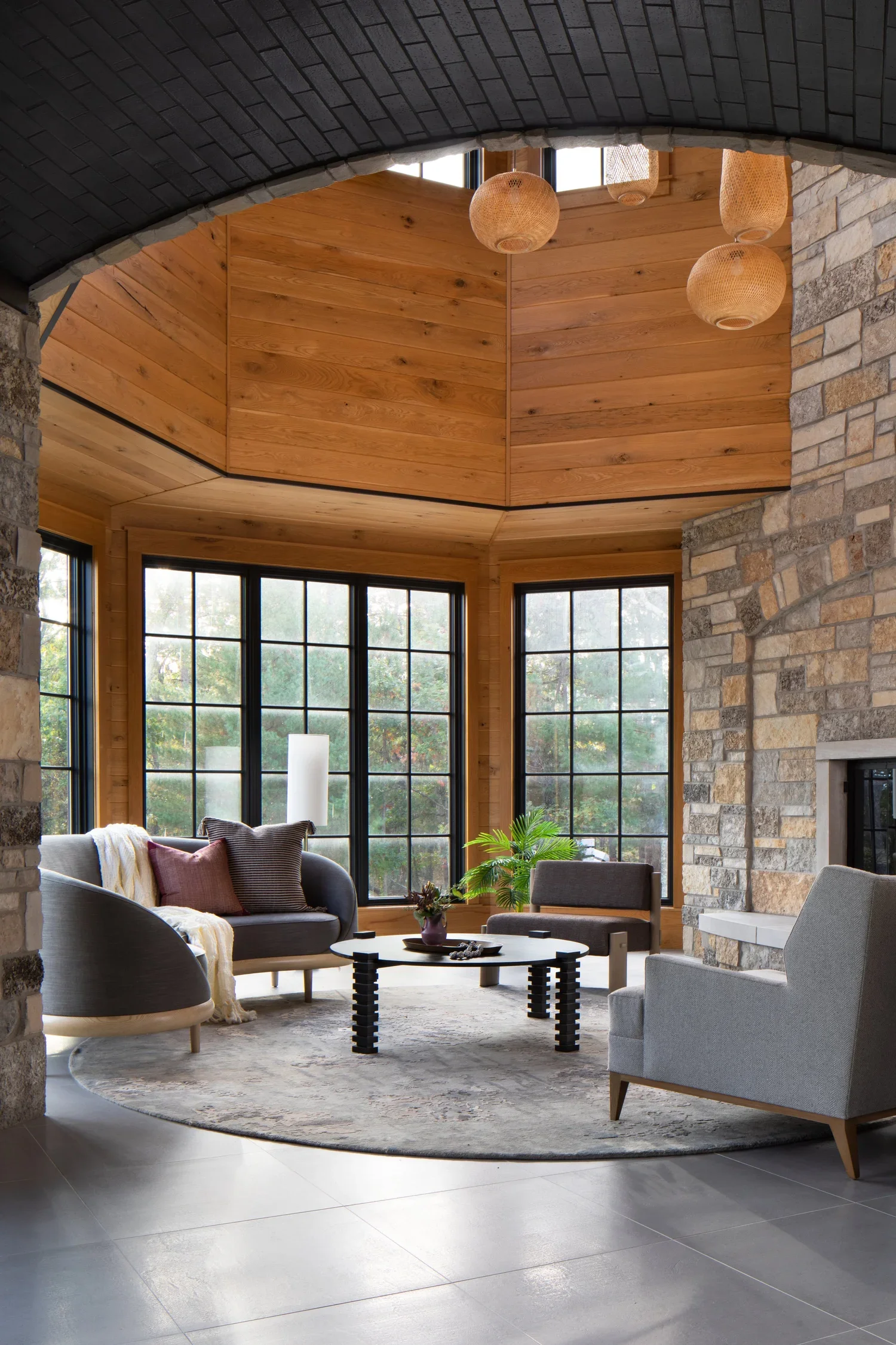 Rooted in the architectural archetype of the Northwoods cabin, this new-build home reinterprets a familiar form with expanded scale, natural materials, and a layout tailored for family life. The clients envisioned a place large enough to host extended gatherings but still comfortable for everyday use. En Masse responded by shaping smaller, well-scaled moments within large volumes—creating a sense of intimacy and flow without losing the cabin’s iconic presence.